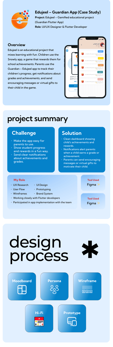 Guardian App – Edujeel is a parent-focused educational application designed to support parents in monitoring their children’s academic progress and achievements. As part of the UI/UX and Flutter team, I designed key user flows, built reusable UI components in Figma, and supported the implementation of core screens in Flutter to enhance usability and consistency.