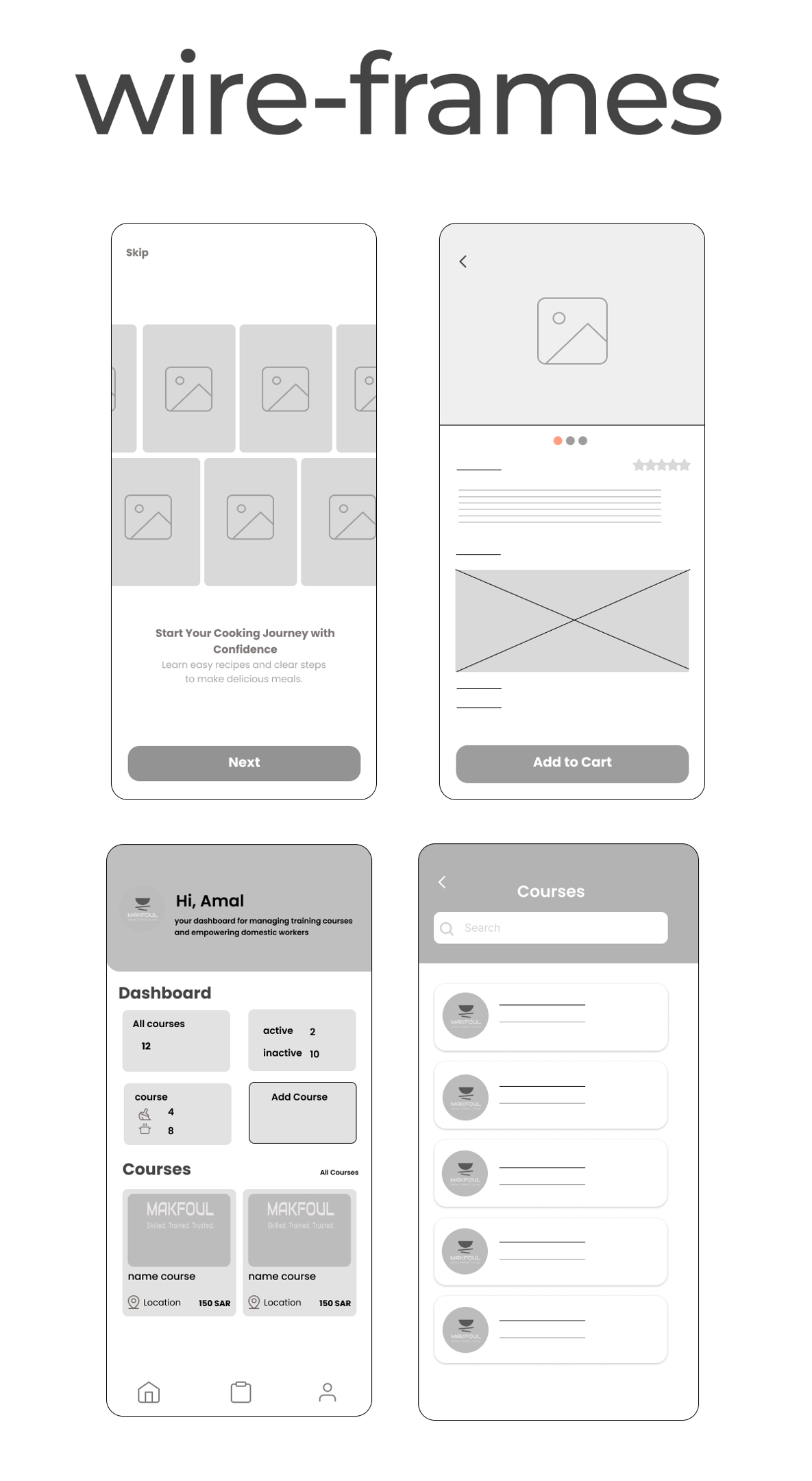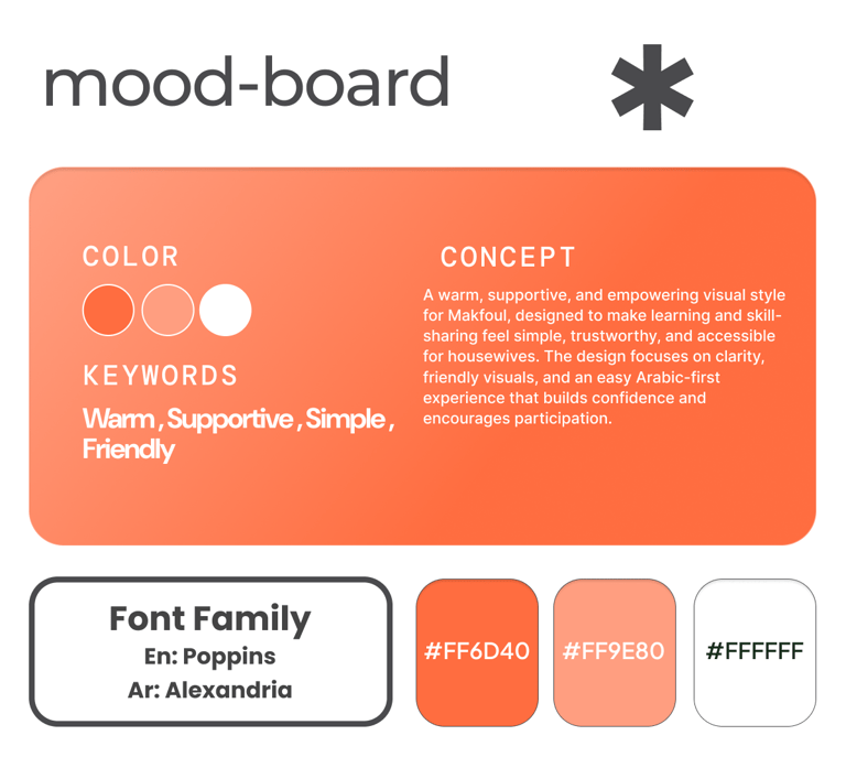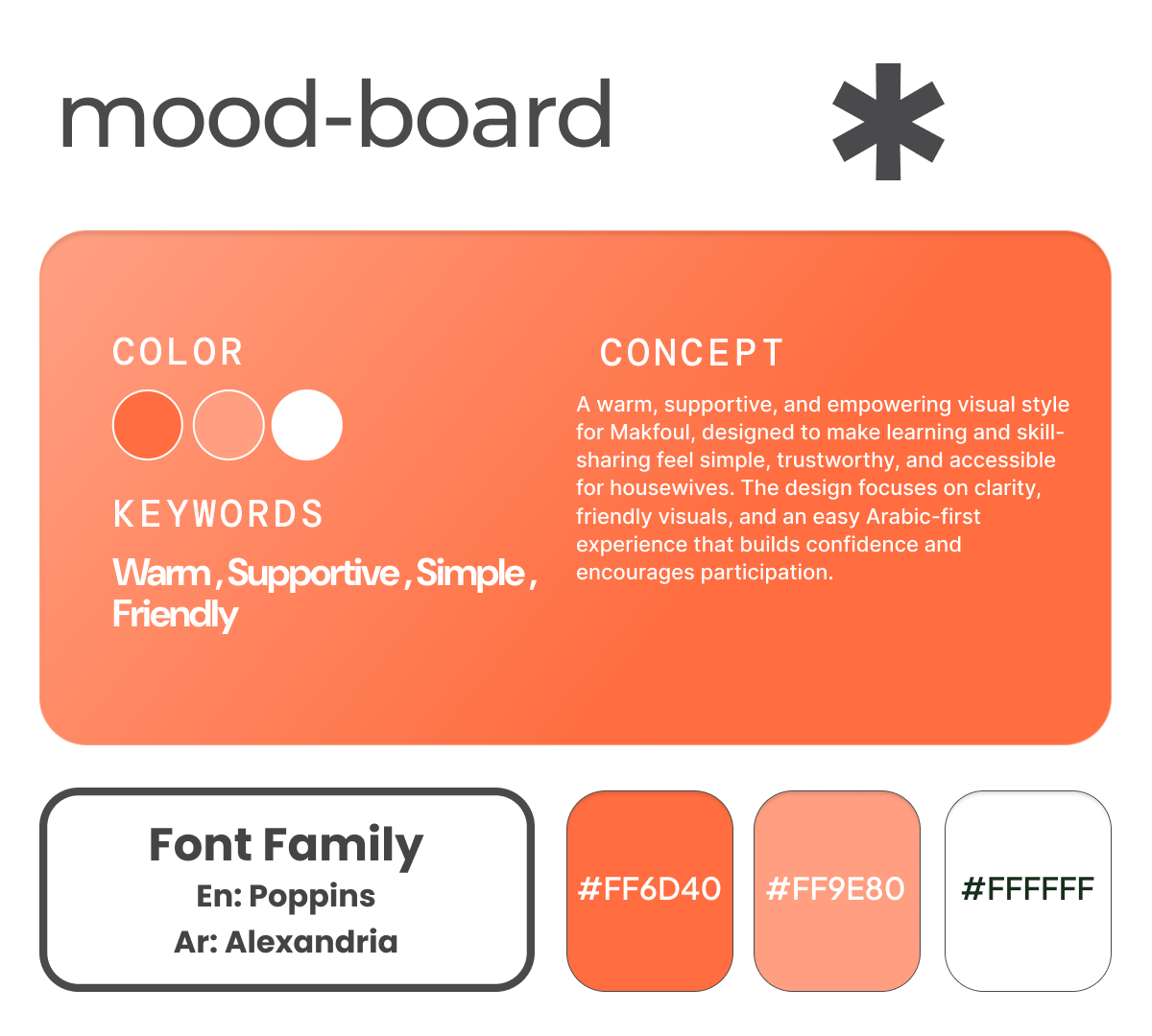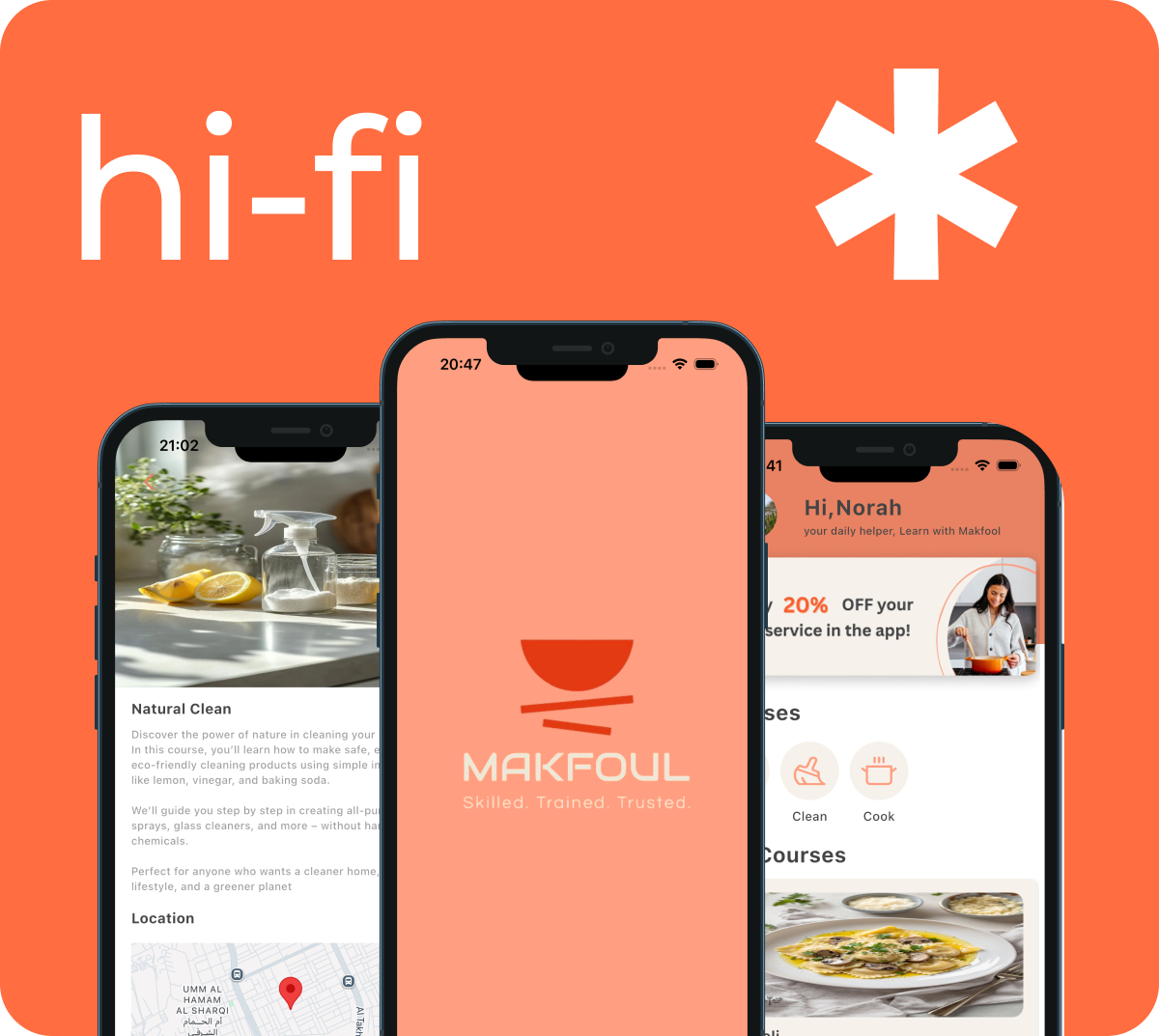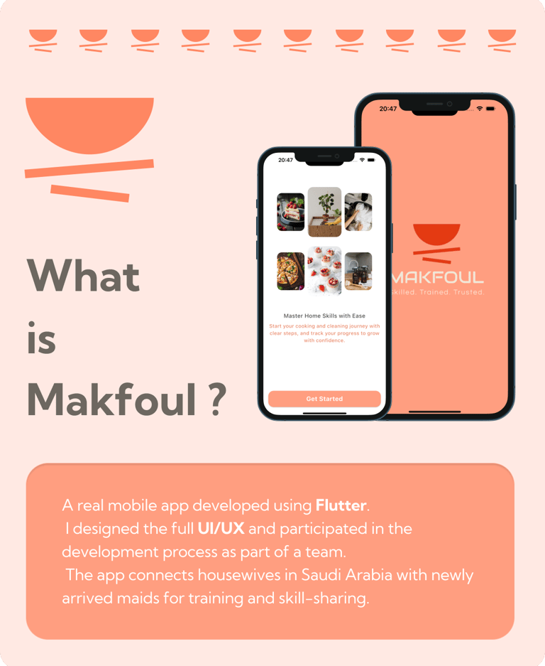 Makfoul App is a marketplace platform designed to connect users with training and service opportunities. I worked as a UI/UX Designer, collaborating with a teammate on the design process, and also contributed to the Flutter development alongside the team. My role included user flows, wireframes, UI design, and supporting implementation.